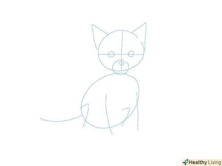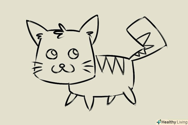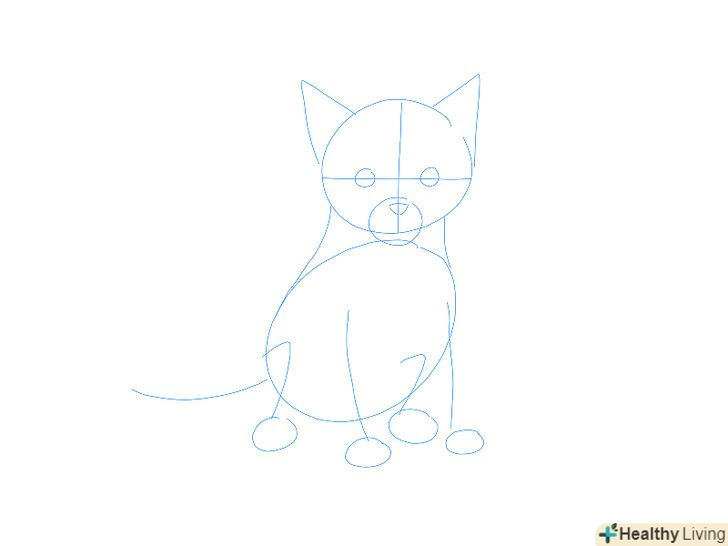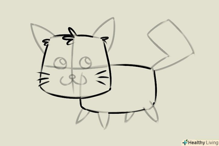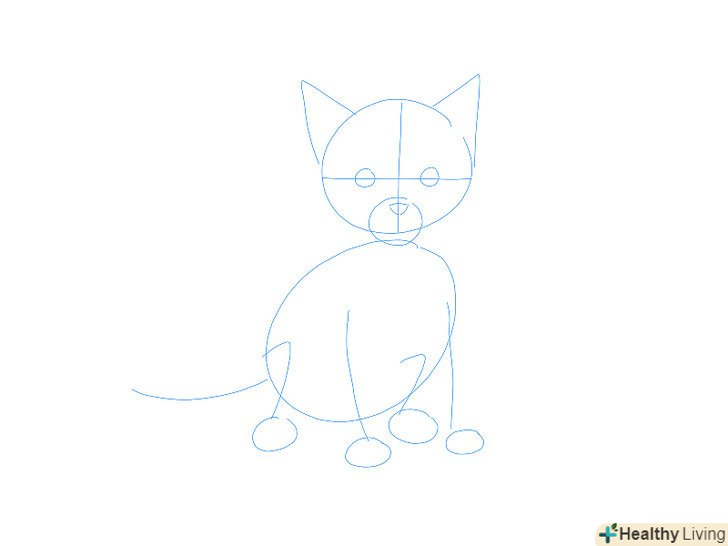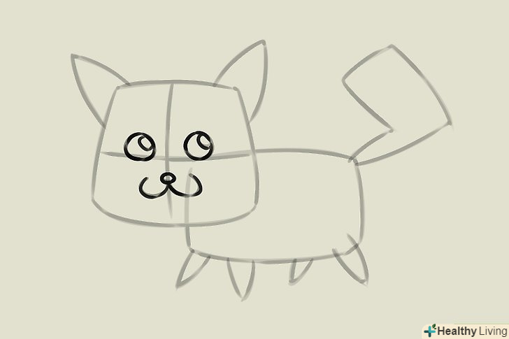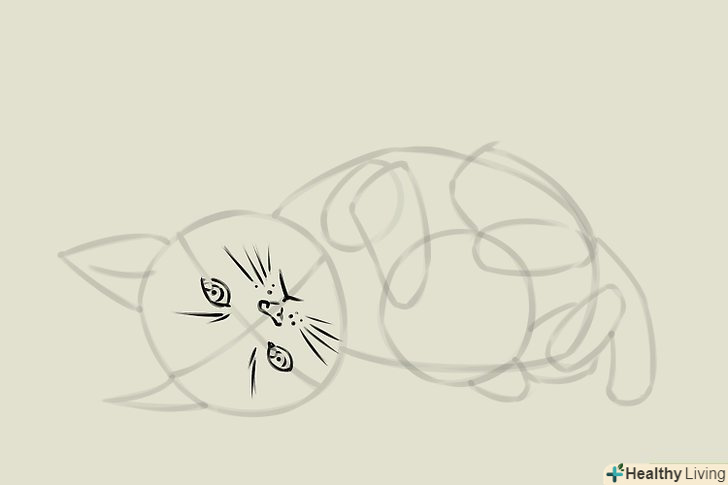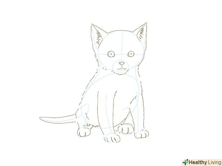 Використовуючи перехрестя на контурі побудови в якості орієнтира, намалюйте очі кошеня, ніс і рот. Ви також можете додати вуса за допомогою довгих штрихів.lt;