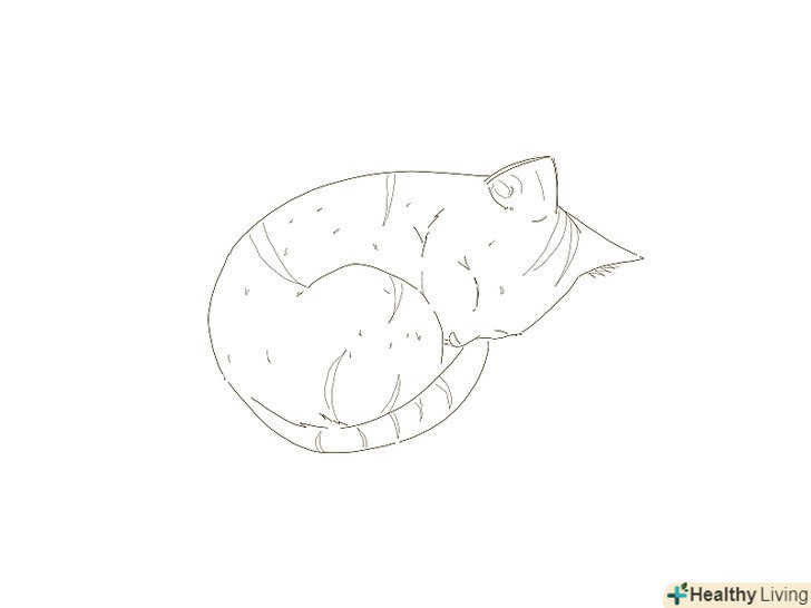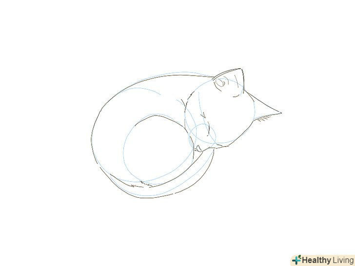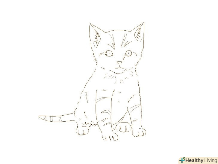 Прорисуйте потрібні лінії голови і тулуба на основі контурів, які ви зробили раніше. Ви можете використовувати тонкі вигнуті лінії для ефекту пухнастої вовни. Додайте вуса на щоках кошеня. lt;