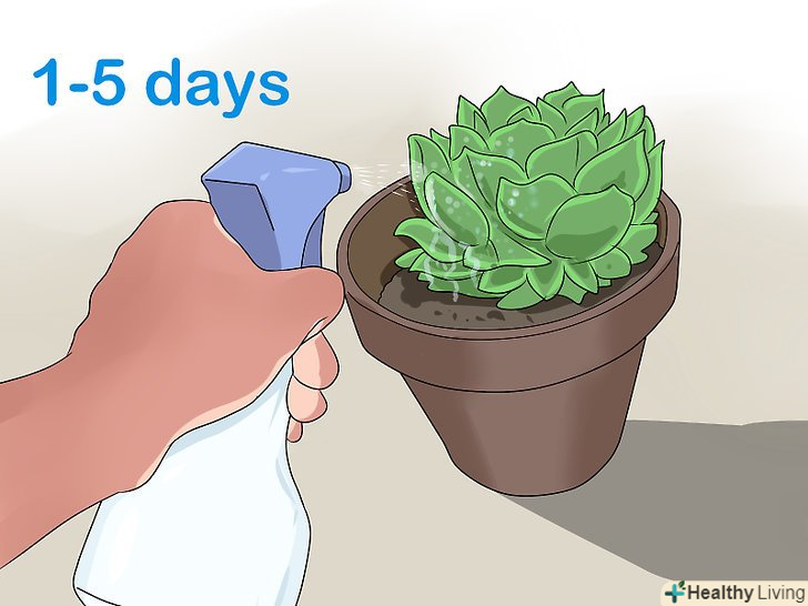 Акуратно обприскуйте Сукуленти кожні 2-4 дні. зазвичай потрібно обприскувати Сукуленти кожні 2-4 дні, але у кожного виду рослин можуть бути свої вимоги. Якщо ви не впевнені, як часто потрібно це робити у вашому випадку, є хороше правило-почекати, поки грунт не висохне, перш ніж обприскувати знову.