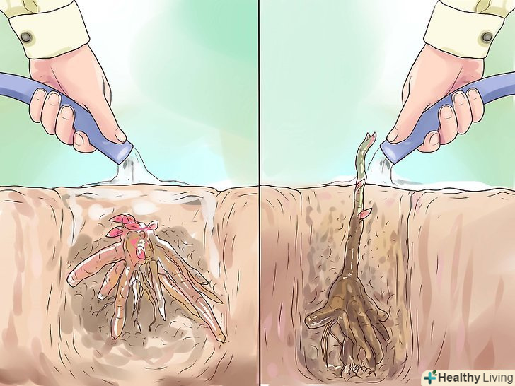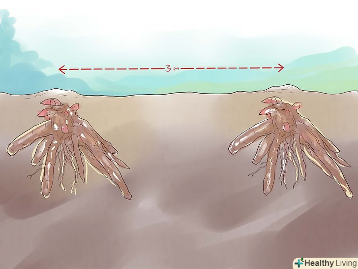 Садіть трав'янисті півонії так, щоб нирки стирчали в 5 см. від поверхні . Помістіть бульби півонії в яму, з маленькими нирками або «очками» спрямованими вгору, а довгими корінням вниз. Нирки не повинно бути більше, ніж 5 см від поверхні, або рослина може не прижитися. Продовжуйте додавати грунт навколо півонії, поки вона не досягне потрібного рівня, обережно притискаючи грунт внизу, щоб видалити повітряні кишені, які можуть висушити рослину. [18]- Сорти, які цвітуть рано, особливо в теплому кліматі, можуть краще рости, якщо посаджені тільки на 2,5 см.в глибину, тоді вони зможуть з'явитися на початку вегетації. [19]