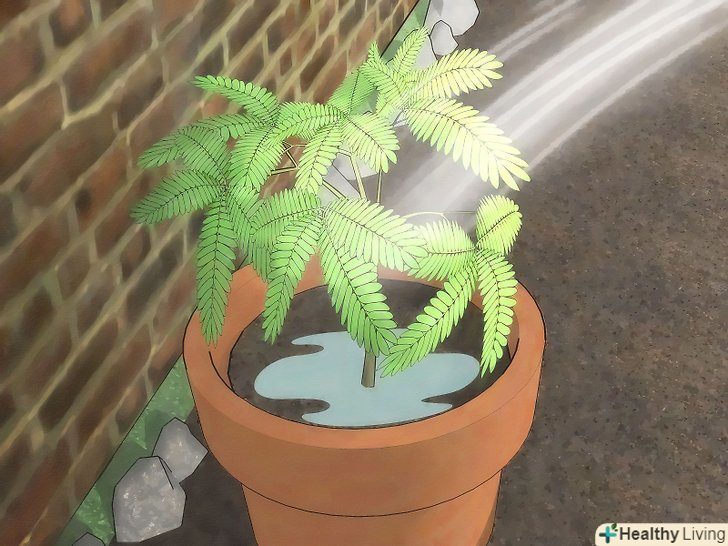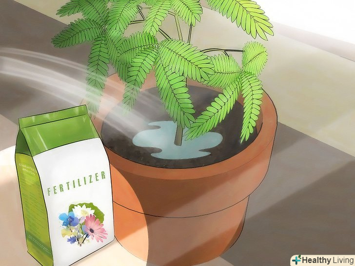 Поливайте і удобрюйте рослину. Мімозу сором'язливу слід регулярно поливати, щоб грунт був постійно зволожений, але і не дуже сирої. Спробуйте грунт з домішкою глини, який добре відводить вологу і не дасть коріння загнити. [7]- У період росту удобрюйте мімозу сором'язливу приблизно раз на два тижні розведеним у воді добривом з високим вмістом калію.