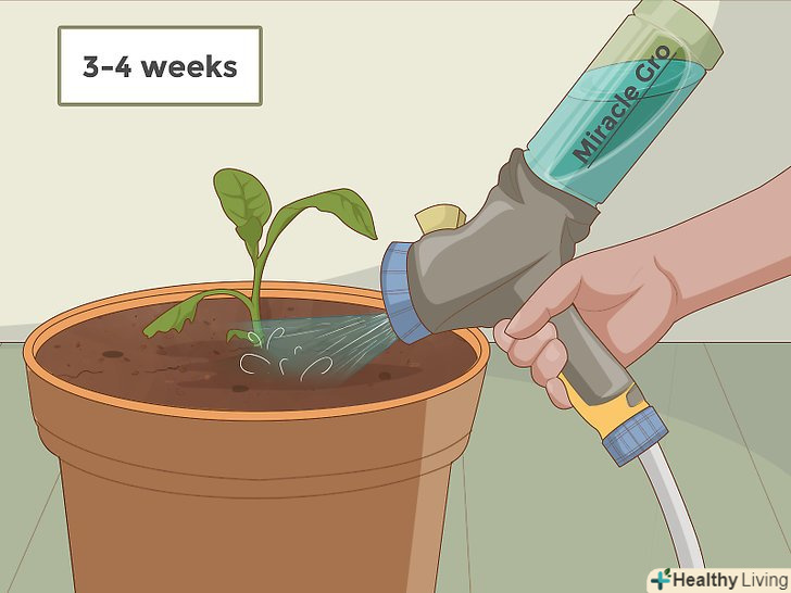 Поливайте розсаду спеціальним розчином для росту (наприклад, таким, до складу якого входять водорості або рибна емульсія). це дозволить рослинам отримувати всі поживні речовини до моменту, коли вони будуть пересаджені у відкритий грунт через 3-4 тижні.- Якщо рослина почала жовтіти і в'янути, може знадобитися ще одна порція добрива. Не перестарайтеся з добривом, оскільки надлишок поживних речовин може спалити коріння або викликати занадто швидке зростання. [6]