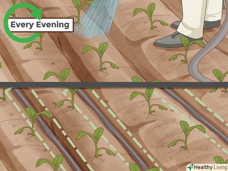 Ретельно поливайте тютюн ввечері кілька днів поспіль після пересадки. коли розсада закріпиться в грунті, поливати можна буде рідше, щоб не допустити скупчення вологи в грунті.- Слідкуйте за тим, щоб грунт був вологим, але не мокрим. Якщо на ділянці можлива посуха, встановіть іригаційну систему. Це не дасть землі висохнути, і рослини тютюну не загинуть. [11]