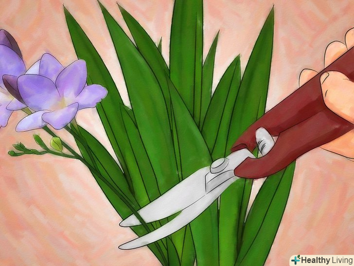 Зачекайте поки листя не пожовтіє, перш ніж видалити її. коли квіти опали, нехай листя продовжують рости. Дочекайтеся, щоб вони пожовкли перед видаленням. Вони продовжують забезпечувати рослину енергією перед відмиранням. Накопичена енергія допоможе вашим фрезіям стати сильними в наступному році. [6]- Після перших заморозків, "зберіть урожай" фрезій, обрізаючи листя і стебла на відстані 2,5 см над землею.