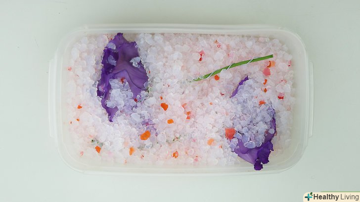 - Додайте нейодовану сіль (необов'язково). деякі вважають, що сіль допомагає пелюсткам зберегти свій колір, хоч і не всі згодні з цим. [29] додайте 3 столові ложки солі на кожен літр десиканту (15 мілілітрів на 1 літр).
