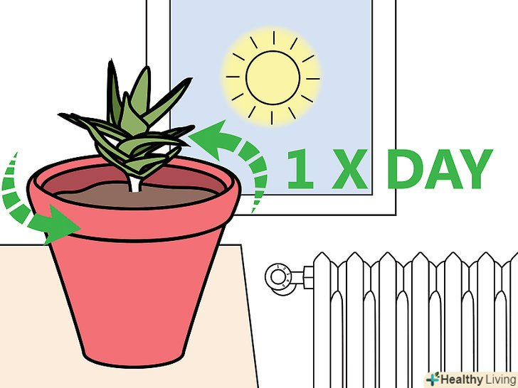 Поставте горщик з рослиною на сонячне місце. якщо ви живете в жаркому кліматі, то виберіть для рослини таке місце, де воно буде отримувати щодня 6-8 годин фільтрованого сонячного світла (на південному або східному вікні). У більш холодному кліматі допустимо 6 годин максимально яскравого сонця. Для кімнатного сукулента виберіть вікно, де рослина може отримати яскраве сонячне світло. [4]- Не ставте сукулент на південне вікно, якщо живете в жаркому кліматі. Якщо ви живете в прохолодному кліматі, перевірте південні вікна: чи не занадто вони нагріваються після обіду. Якщо буде занадто багато сонячного світла, рослина може отримати опіки.