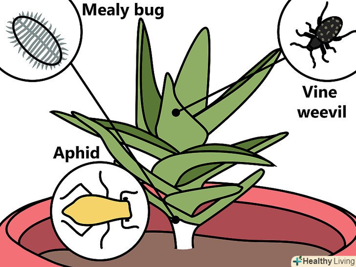 Навчіться розпізнавати звичайних шкідників. червець борошнистий, попелиця і довгоносики — найбільш поширені шкідники, яких приваблюють Сукуленти. Перевірте рослину на наявність червця борошнистого в тому місці, де листок кріпиться до стебла. Тлю шукайте на листках, стеблах і квіткових бутонах. Слідкуйте за неправильним ростом або млявістю рослини: це може вказувати на виноградного довгоносика або кореневого червця борошнистого. [9]- Червець борошнистий зазвичай розміром 2-3 мм і схожий на воша. При своїй першій появі він залишить кульки білого пуху на рослині. Кулька при роздавлюванні залишає червону пляму.