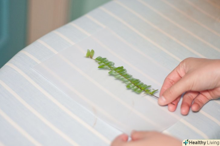 Під навощений папір з папороттю підкладіть листок паперу, щоб захистити прасувальну дошку. ще один аркуш паперу покладіть зверху. Підійде звичайний папір для друку. Накрийте все це щільною тканиною, наприклад, рушником.