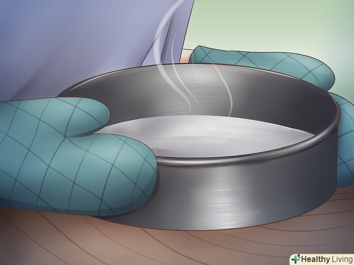Зніміть розплавлений віск з плити. Будьте дуже обережні, оскільки розплавлений віск дуже гарячий. Акуратно поставте його на робочий стіл. Слідкуйте за тим, щоб ємність з воском не перекинулася. Це особливо важливо враховувати, якщо у вас в будинку є тварини або діти.