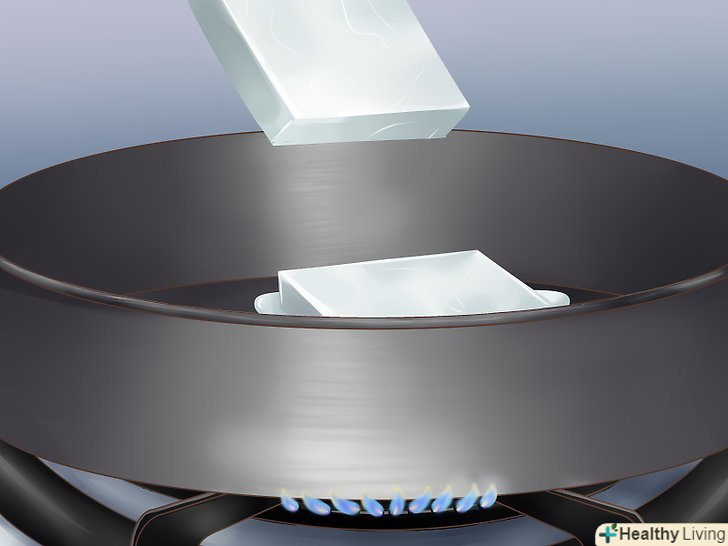 Розплавте парафіновий віск в одноразовому посуді. 450 г парафінового воску слід розтопити в одноразовому посуді, нагрів її на повільному вогні. [2]- Щоб розплавити парафіновий віск швидше, поріжте його на великі шматки, і розподіліть їх рівномірно по дну одноразового посуду.