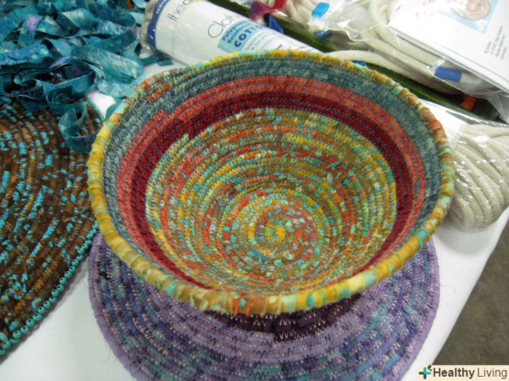 Зробіть кошик. її дуже легко зробити з клаптиків, нарізаних на смужки. Оберніть ними по спіралі білизняну мотузку і прошийте зигзагом на швейній машині.