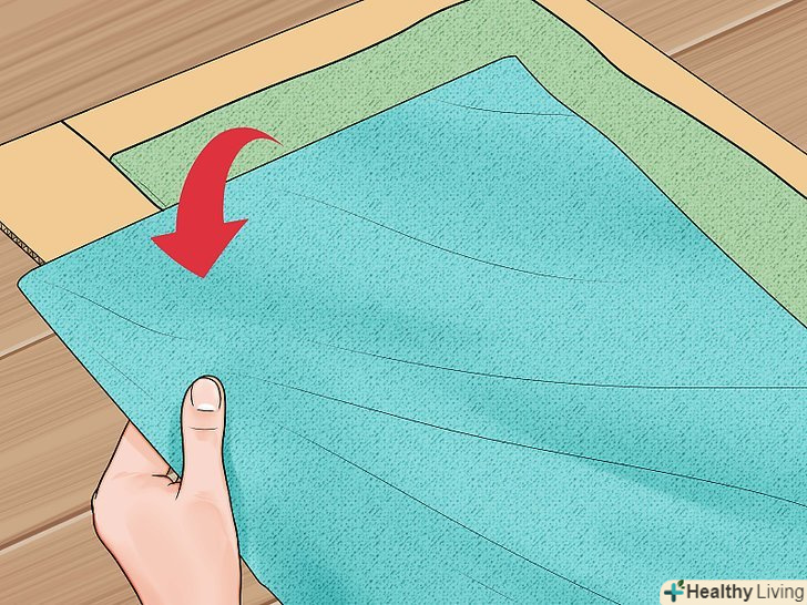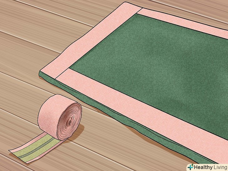 Переверніть килим лицьовою стороною вгору, нанесіть крапельку килимового клею по кутах і приблизно на 1,3 см у верхній частині покриття. потягніть окантовку вгору по краю килима і на крапельку клею зверху, щільно притисніть.