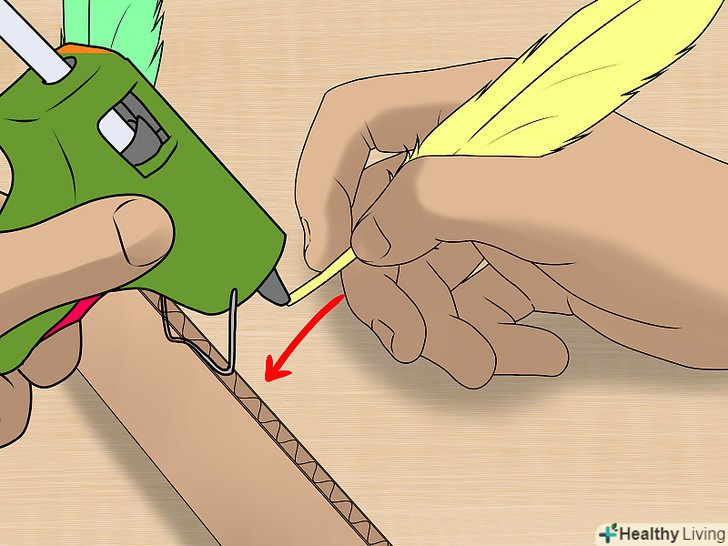 Вставте пір'я в отвори гофрованого картону. нанесіть трохи клею на кожне отвір картонної смуги, в яке буде вставлятися перо. Вставте в змащені клеєм отвори стрижні штучного пір'я і дайте клею висохнути.- Щоб пір'я краще приклеювалися, можна вставляти їх в Плоско лежить смугу картону, а не в стоїть вертикально.