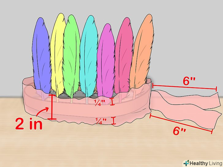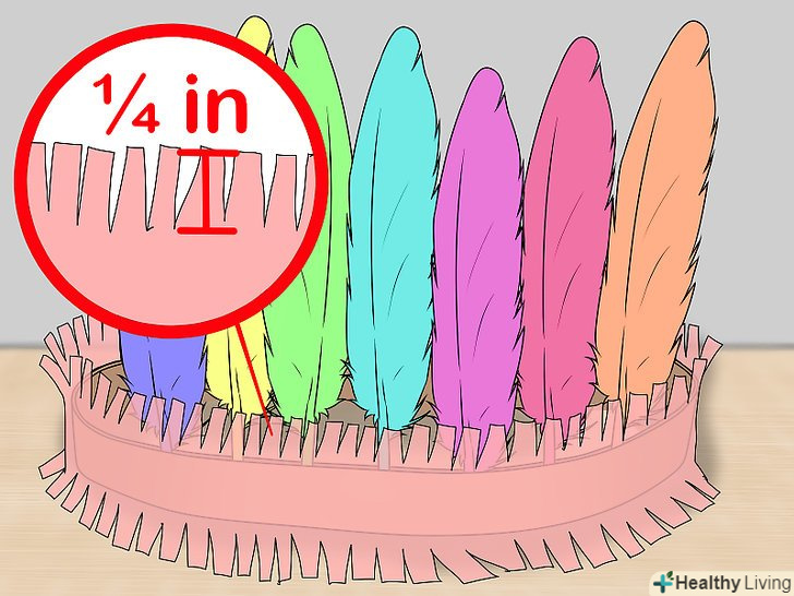 Приклейте паперові пір'я до наголов'я. Приклейте паперові пір'я з внутрішньої сторони оголовья і дайте клею висохнути. Пір'я повинні бути звернені вгору і розходитися віялом з однієї точки. Одне центральне перо може стояти строго прямо, але інші повинні вийти нахиленими.