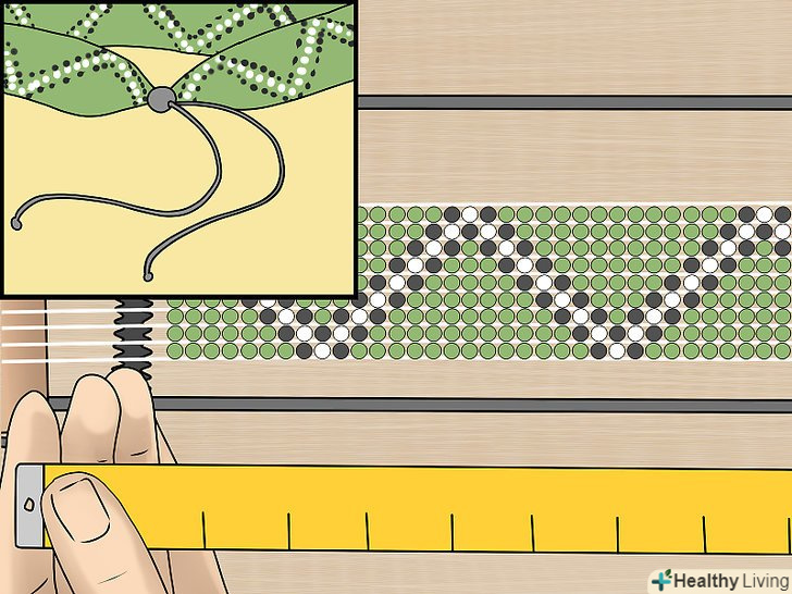 Наберіть бісер на довгу нитку. розташуйте дизайн вертикально, щоб він відповідав положенню ткацького верстата і почніть підрахунок бісеру з верхнього ряду. Відрахуйте бісер для перших п'яти рядів і нанижіть його на нитку в тому порядку, в якому ви вважали. Перший ряд вважається зліва направо, другий-справа наліво, потім знову зліва направо і так далі.- Саме в такому порядку ви будете переплітати нитку з нанизаним бісером з нитками натягнутою на верстаті основи плетіння (спочатку зліва направо, потім справа наліво і так далі).