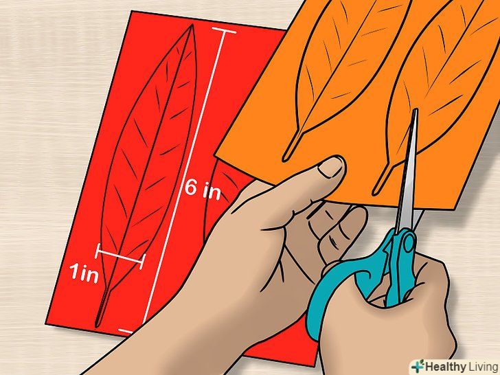Зберіть необхідні матеріали. Вам будуть потрібні ножиці, сантиметрова стрічка, лінійка, коричнева конструкторська папір, воскові олівці або фарби, канцелярський клей або клейовий пістолет і пір'я (стільки, скільки вам захочеться використовувати) або конструкторський папір інших кольорів. Якщо ви будете робити паперові пір'я, то для заготовок пір'я з листа конструкторської паперу доведеться нарізати поперечні смужки шириною близько 2,5 см.ви можете придбати конструкторську папір різних кольорів і виготовити 1-2 пера з паперу кожного наявного кольору.