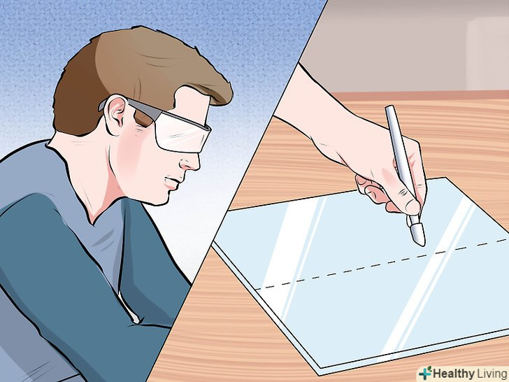 Одягнувши захисні окуляри, підготуйте і відріжте відпалене скло. за допомогою косинця накресліть лінію відрізу, і тримайте косинець уздовж цієї лінії. За допомогою склоріза відріжте скло по цій ліній, натисканням середньої сили зробивши уздовж неї подряпину. Не проводьте склорізом уздовж лінії більше одного разу.