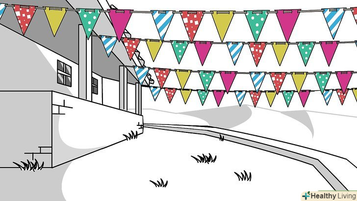 Повісьте гірлянду. повісьте прапорці на стіну, прив'язавши кінці стрічки до вбитих в неї цвяхів або закріпивши їх за допомогою креслярських кнопок. Прапорці чудово прикрасять стіну над каміном або ліжком, майданчик для пікніка або барбекю, класну кімнату, дитячу, а також будь-яке приміщення, де планується вечірка.