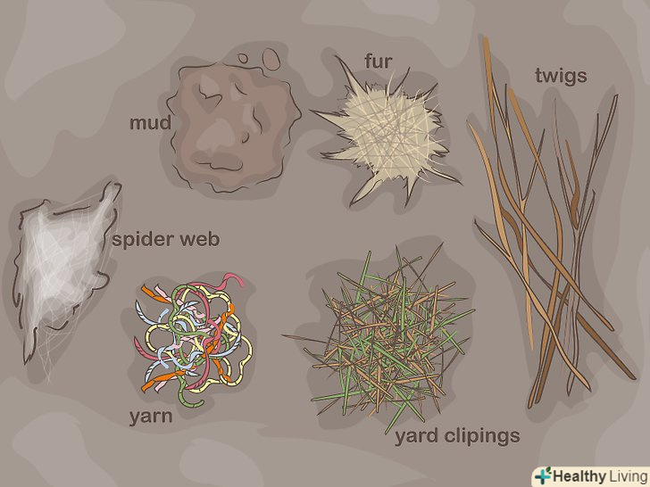 Залиште у дворі матеріал для побудови гнізда. це простий спосіб залучити птахів, і його варто спробувати, навіть якщо в кінці кінців ви вирішите спорудити готове гніздо. Якщо вам вдалося знайти конкретну інформацію про гнізда, ви будете знати, які матеріали залишити, але в будь-якому випадку ви не помилитеся, якщо покладете на видних місцях кілька предметів з наступного списку: [8]- Жорсткі гілки (для птахів, що влаштовують гніздо за типом майданчика) і гнучкі гілки (для птахів, що в'ють гніздо у формі чаші)