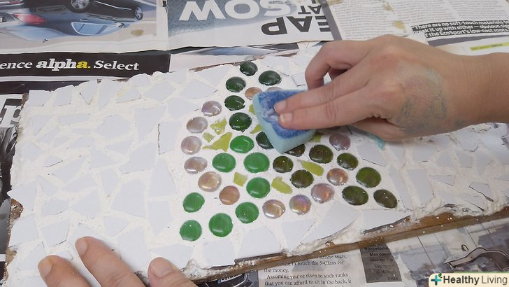 Дайте затирці застигнути і зітріть надлишки. зверніться до інструкцій, щоб дізнатися, як довго буде застигати затирка. Зазвичай на це йде всього близько 20 хвилин. Потім слід протерти мозаїку чистою губкою, змоченою теплою водою. Регулярно споліскуйте губку, стираючи надлишки затірки з поверхні мозаїчної плитки. [14]- Якщо на мозаїчній плитці залишилися розлучення від затірки, приберіть їх за допомогою нетканої серветки, яка не залишає ворсинок, або зім'ятого листа газети. Видаляйте великі шматки затірки з мозаїки за допомогою кухонної нейлонової мочалки, що не залишає подряпин, або невеликий дерев'яної палички.