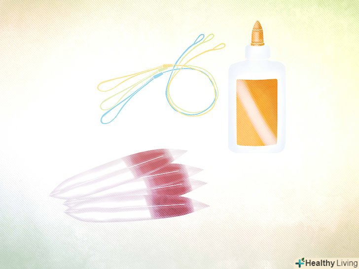 Закріпіть на голому стрижні кожного пера петлю зі шкіри. наріжте смужки щільної, але тонкої шкіри шириною по 5 мм і довжиною по 11 см.зігніть смужки поперек навпіл і вкладіть в них стрижні пір'я (поздовжньо), щоб на кінці стрижня утворилася невелика петля зі шкіри, в яку можна буде протягнути шнур. Закріпіть смужки клеєм і почекайте, поки він висохне, перш ніж продовжувати роботу. [6]- Якщо ви хочете використовувати традиційні матеріали, шкіру можна прив'язати до перу за допомогою вощеного шнура через отвори, виконані в стрижні пера шилом. [7]