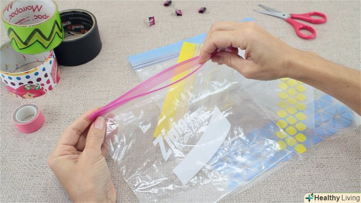 - Наклейте дві смуги непрозорого герметизуючого скотча на лицьову сторону майбутнього пенала. відріжте дві смужки герметизуючого скотча на 5 см більше довжини пенала. Накладіть першу смугу на папку-конверт горизонтально безпосередньо під ЗІП-застібкою. Другу смужку наклейте прямо під першою. [10]