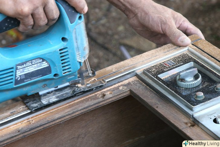 Зверху зробіть кришку. найкраще буде зрізати наявну верхню панель уздовж стиків.- Закріпіть петлі і зробіть кришку відкидний. Також можна зняти наявну верхню панель і замінити її новою відкидною кришкою, попередньо обробивши деревину морилкою, щоб вона була схожа на старе дерево.