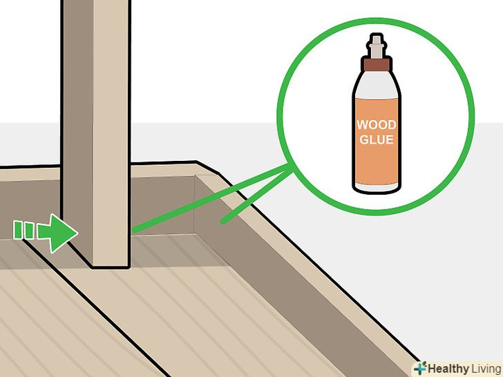 Приклейте ніжки в кутах опорної рамки. ніжки необхідно розташувати в кутах опорної рамки, де її деталі стикуються один з одним. Нанесіть клей у Кутах на внутрішню сторону опорних рамок і нижню сторону стільниці. Потім встановіть ніжки в кути і закріпіть лещатами.- Можна почекати, коли клей висохне, але це не обов'язково. Просто тримайте ніжки надійно скріпленими за допомогою лещат, щоб вони не змістилися, коли ви будете фіксувати їх саморізами.