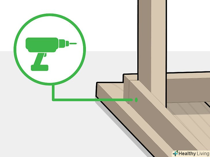 Просвердлите наметочние отвори в опорній рамці і ніжках столу. шурупи повинні розташуватися по центру кожної області зіткнення ніжки з опорною рамкою. Свердлите отвори з боку опорної рамки у напрямку до ніжки. Використовуйте свердло діаметром близько 6 мм (але тонше, ніж використовувані саморізи), щоб виконати перше наметочное отвір в деревині ніжки. Повторіть те ж саме з іншого боку опорної рамки. В цілому у вас вийде 8 наметочних отворів. [8]- Якщо ви хочете додатково скріпити ніжки поперечинами, процес буде дещо складніше. Вам буде потрібно циркулярна пила, щоб зробити на кожній ніжці пази глибиною трохи менше, ніж половина товщини бруса. На кожній ніжці буде необхідно зробити по 2 паза (по одному з кожного боку, де будуть кріпитися поперечки.