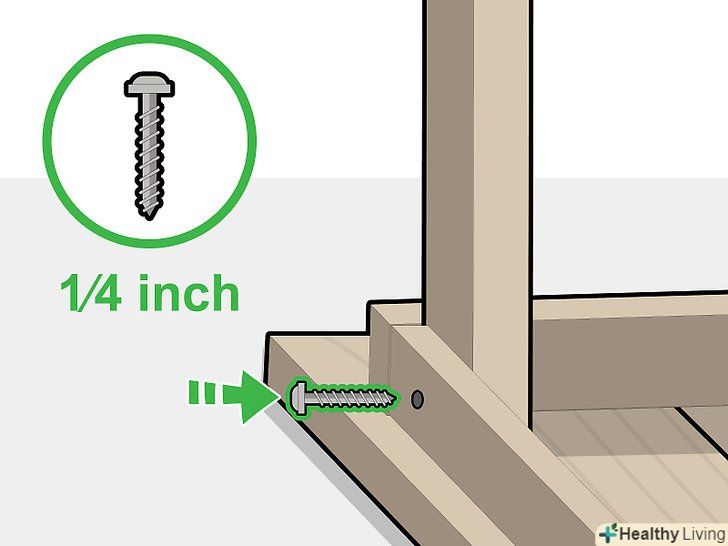Прикріпіть ніжки столу до опорної рамці саморізами. використовуйте для кожної ніжки по два самореза діаметром близько 7 мм.вкрутіть саморізи через опорну рамку в ніжки. Використовуйте для цього викрутку-тріскачку. [9]- Не вкручуйте саморізи дрилем. Вони можуть йти дуже туго і випадково обломитися.