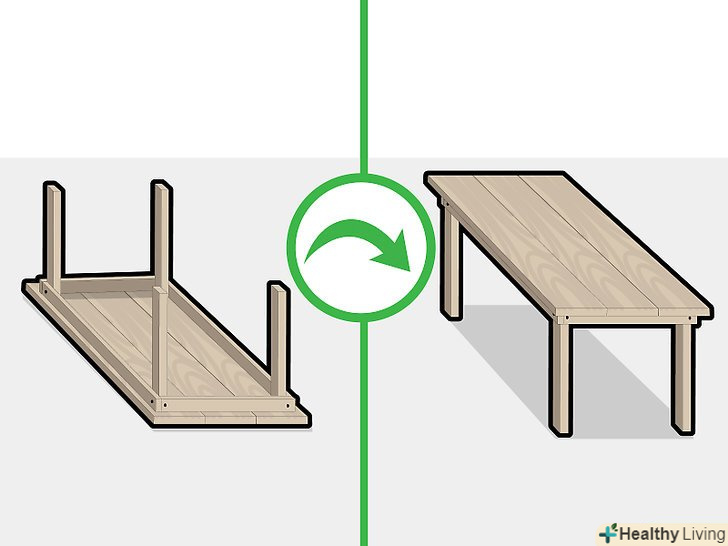 Переверніть стіл на ніжки, щоб перевірити його стійкість. обережно переверніть стіл. Він може виявитися досить важким! Поставте його на підлогу і спробуйте покачати. Якщо стіл хитається-значить, ніжки вийшли недостатньо ідеальними. Можливо, вони різної довжини-в цьому випадку вам буде потрібно перевернути стіл назад і вкоротити ніжки до однакової довжини.- Хоча ніжки можна різати циркулярною пилкою або ножівкою, однак при цьому легко помилитися і вкоротити їх занадто сильно. Замість цього краще трохи сточити деякі ніжки за допомогою наждачного паперу з зерном 80, а потім зачистити їх наждачним папером з зерном 220.