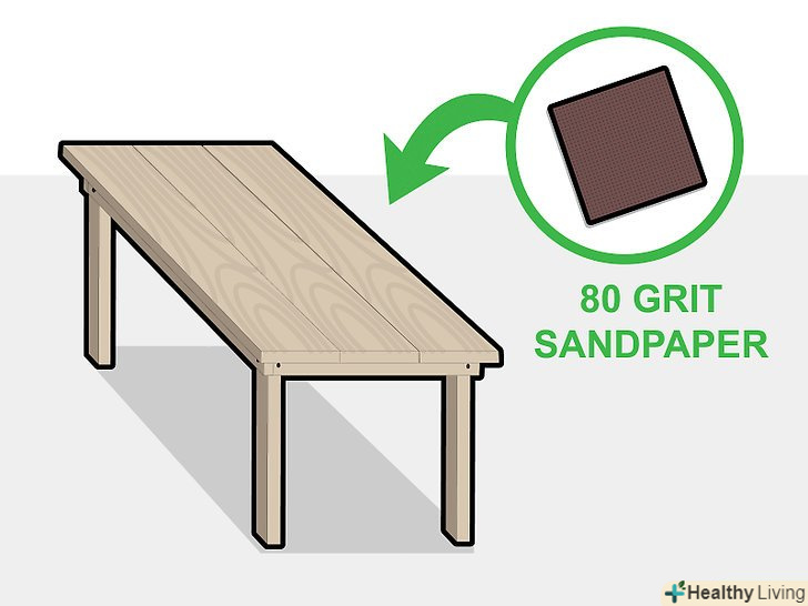 Відшліфуйте стіл наждачним папером з зерном 80. це грубозерниста наждачний папір, тому вона зробить деревину трохи шорсткою, що абсолютно нормально. Просто думайте про те, як буде виглядати стіл в готовому вигляді! Якщо придивитися до деревини, ви помітите напрямок її волокон (ліній). Пройдіться наждачним папером по всій поверхні деревини у напрямку її волокон (включаючи нижню сторону столу і ніжки). [10]- Щоб спростити собі роботу, скористайтеся стрічкової шліфмашиною. Малоймовірно, що вона залишить після себе на поверхні столу будь-які стійкі дефекти, коли ви обробите з її допомогою свій виріб всього один раз.
