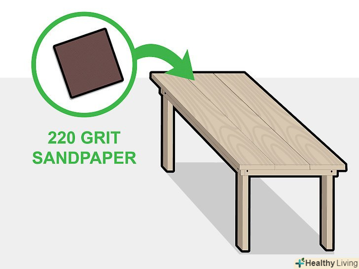 Скористайтеся наждачним папером зерном 220, щоб остаточно відполірувати поверхню столу. вдруге пройдіться по всій поверхні столу дрібнозернистим наждачним папером. Обов'язково працюйте у напрямку деревних волокон. Обережно сточіть будь-які шорсткі ділянки, щоб підготувати їх до Тонування морилкою. [11]