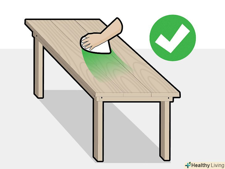 Протріть стіл, щоб видалити з нього всі забруднення. на даний момент на поверхні вашого столу буде багато звичайного пилу і тирси. Змочіть ганчірку з мікрофібри або спеціальну ганчірку для пилу в ледь теплій воді. Протріть з її допомогою весь стіл, щоб видалити пил, і почекайте, коли він просохне.- Можливо, ви захочете пропилососити стіл, перш ніж протирати його. Користуйтеся безпосередньо шлангом від пилососа, щоб зібрати якомога більше пилу.
