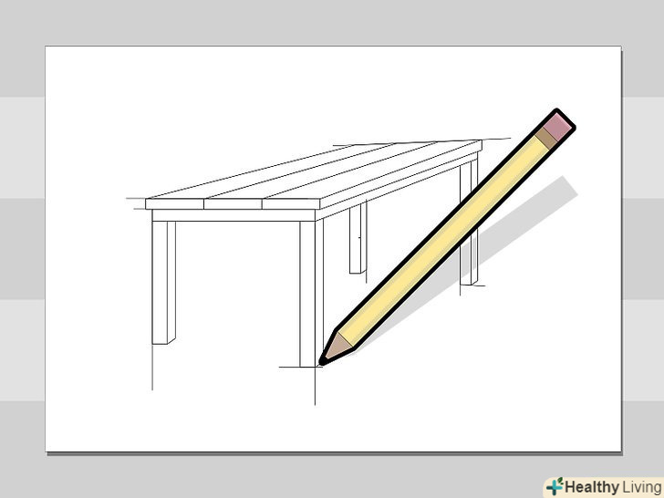Зробіть схематичний начерк столу на папері. скористайтеся олівцем і лінійкою, щоб зобразити ідеальний для себе стіл. Поки не переживайте про точні розміри. Просто уявіть, яким чином повинен виглядати ваш стіл в готовому вигляді. Наділіть його необхідними вам особливостями, а вже потім подумайте про розміри.- Коли буде готовий приблизний проект столу, проставте на ньому олівцем відповідні розміри. Конкретні розміри пиломатеріалів, які ви збираєтеся використовувати, можна дізнатися в будівельних магазинах.