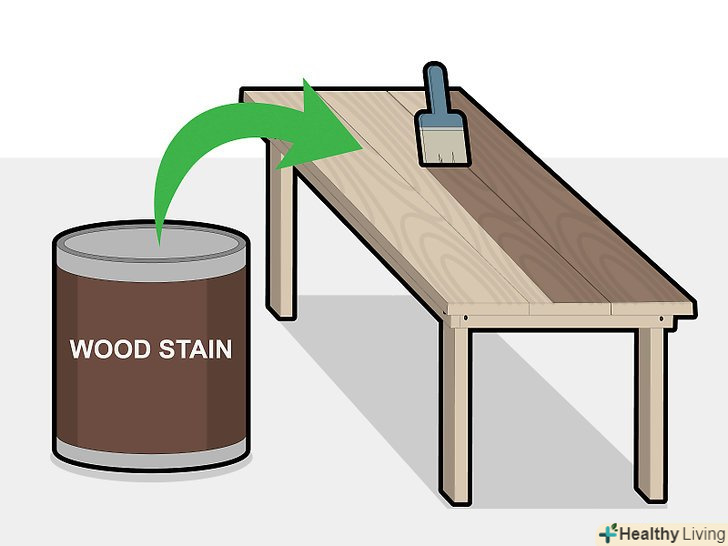 Обробіть деревинуМорилкою за допомогою губчастої кисті або ганчірки. одягніть гумові рукавички, відкрийте морилку і підготуйте її відповідно до інструкцій виробника. Потім змочіть морилкою губчасту кисть або ганчірочку. Пофарбуйте складом всю поверхню деревини, працюючи без зупинки у напрямку деревних волокон. Покрийте морилкою весь стіл, а потім зітріть її надлишки ганчіркою. [12]- Морилки бувають різними. Склади на основі масел добре проникають в деревину і створюють досить стійкий результат. Водорозчинні морилки легко наносяться, але вбираються в деревину нерівномірно. Гелеві морилки досить густі і створюють сильний ефект Тонування.
