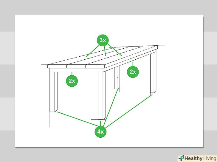 Підрахуйте, скільки пиломатеріалів вам знадобиться. Розбийте проект столу на складові його базові елементи. У простого столу будуть такі елементи, як стільниця, ніжки і з'єднує їх опорна рамка. Якщо ви плануєте забезпечити стіл додатковими елементами, не забудьте врахувати матеріали і для них., [1]- Наприклад, спробуйте виготовити стіл зі стільницею з трьох дощок перетином 5 см х 30 см і довжиною по 150 см, ніжками з чотирьох шматків бруса перетином 10 см х 10 см і довжиною по 70 см і опорної рамки з двох дощок перетином 5 см х 10 см і довжиною по 75 см, а також двох дощок перетином 5 см х 10 см і довжиною по 145 см.