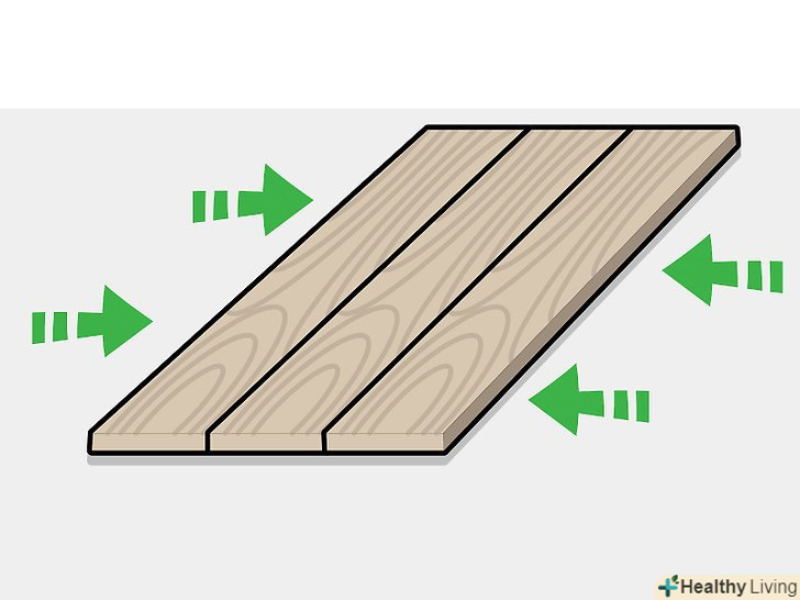Укладіть дошки стільниці на плоскій поверхні пліч-о-пліч один з одним. постарайтеся вибрати максимально рівну поверхню для роботи, щоб стільниця вийшла рівною. Виберіть на кожній використовуваній дошці стільниці лицьову сторону. Покладіть всі дошки лицьовою стороною вниз. Розташуйте дошки саме таким чином, як це передбачає підготовлений вами проект столу. [3]- Виготовляючи великий стіл, працюйте на підлозі. Щоб нічого не пошкодити і не подряпати, підлогу можна попередньо застелити простирадлом або брезентом.
