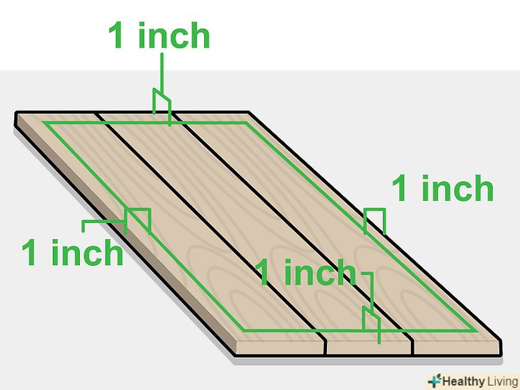 Розмітьте положення опорної рамки на нижній стороні стільниці. опорна рамка кріпиться до самої стільниці і ніжок столу, не даючи цим деталям зміщуватися. Від країв стільниці відміряйте вглиб приблизно по 2,5 см.потім олівцем прокресліть тут лінію, яка буде позначати місце кріплення опорної рамки до стільниці.- Наявність відступу в 2,5 см дозволить не допустити таку ситуацію, коли опорна рамка стирчить з-під стільниці. Крім того, так ви залишаєте під столом трохи більше місця для вільного розташування ніг між його ніжками і, в цілому, покращуєте зовнішній вигляд столу.