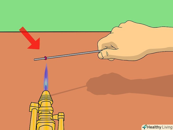 Коли будете готові приступити до формування намистин, візьміть спицю в другу руку. одночасно провертайте скляну трубку, тримаючи її в полум'ї пальника, щоб не давати склу застигати або капати. Розігрійте спицю у вогні пальника, тримаючи її горизонтально під скляною паличкою.