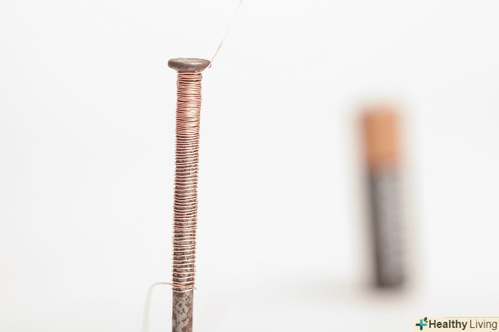 Оберніть цвях. Відступіть від початку дроту приблизно на 20 сантиметрів і щільно оберніть цвях. Кожен виток дроту повинен стикатися з попередньому, але не заходити на нього. Продовжуйте, поки цвях не буде обгорнутий від кінчика до капелюшка.- Обертайте цвях в одному напрямку. Для того, щоб створити магнітне поле, Електрика повинна йти в одному напрямку.