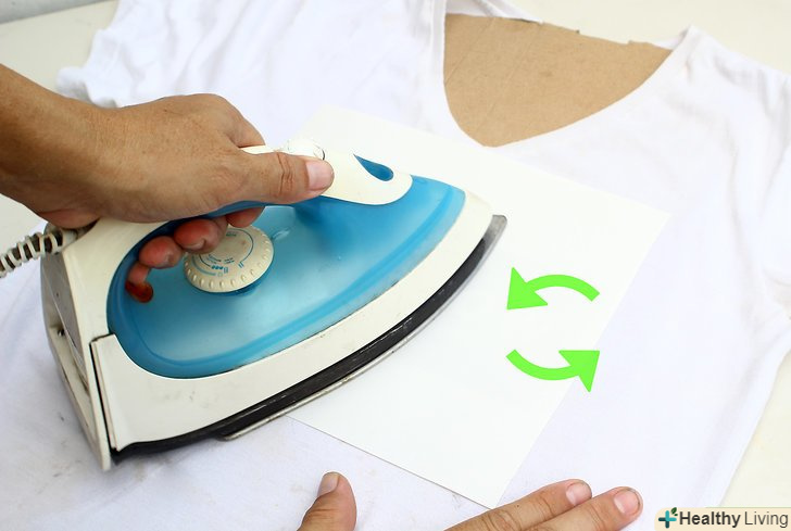 Рівномірно розігрівайте малюнок праскою. робіть великі кругові рухи праскою поверх паперу. Почніть з країв заготовки і поступово рухайтеся до центру. Натискайте праскою послідовно і пропрасовуйте приблизно 3-4 хвилини. Постійно переміщайте праску, щоб не спалити тканину. [15]- Перш ніж завершити прасування і перейти до наступного кроку, перевірте, чи прилипли краї до полотна. Якщо малюнок не приклеївся повністю, продовжуйте гладити, сильніше натискаючи на краї паперової заготовки. Тиск при цьому має бути рівномірним.