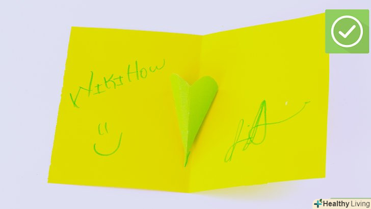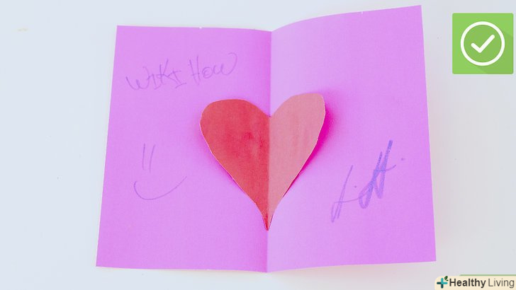 Прикрасьте листівку. Об'ємна частина листівки готова і ви можете написати своє повідомлення і оформити листівку до кінця. Можна написати що-небудь на самому сердечку або поруч з ним. Нанесіть трохи блискіток, додайте стрічку до листівки або щось інше, що зможете підшукати з цієї нагоди. Готово!