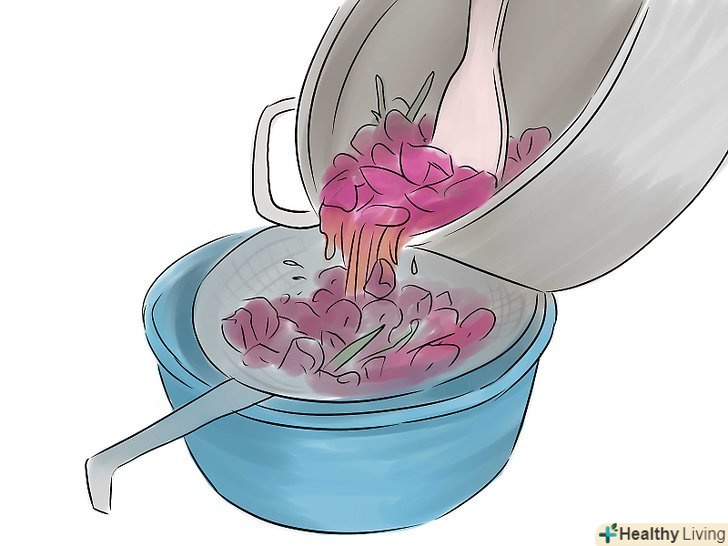 Процідіть ароматну воду, пелюстки і квітки. помістіть сито поверх миски, вилийте в нього воду з квітами з банки. Пелюстки і квіти при цьому залишаться на ситі, а вода процідиться в миску.