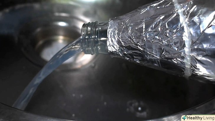- Оберніть літрову скляну пляшку двома шарами алюмінієвої фольги. Візьміть скляну пляшку з вузькою шийкою і закривається кришкою, щоб багаторазово використовувати її в якості термоса. Відірвіть досить великий лист алюмінієвої фольги, щоб в нього можна було загорнути всю скляну пляшку. Як можна щільніше оберніть фольгу навколо скляної пляшки і закріпіть її скотчем. Для кращої теплоізоляції накладіть поверх першого шару додаткові шари фольги. [4]