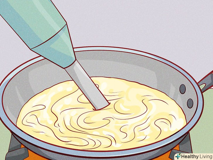 Зачекайте, поки температура розчину і суміші досягне 35-45 °C. потім додайте до лужного розчину лактат натрію. Порошок куркуми змішайте з сумішшю масел рослинного і тваринного походження за допомогою погружного блендера. [21]- Якщо ви використовуєте дерев'яну форму для мила, застеліть її пергаментним папером, поки розчин нагрівається.