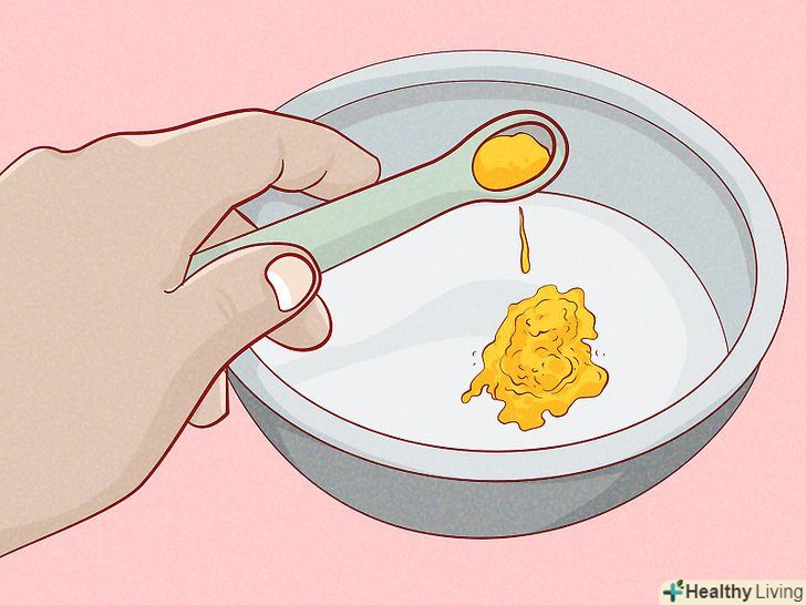 Гарненько розмішайте порошок куркуми. щоб мило вийшло яскравого, золотисто—жовтого кольору знадобиться 1 чайна ложка порошку куркуми. Додайте ще трохи порошку, якщо хочете отримати глибокий колір. [4]