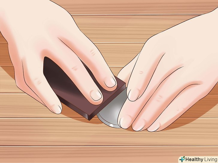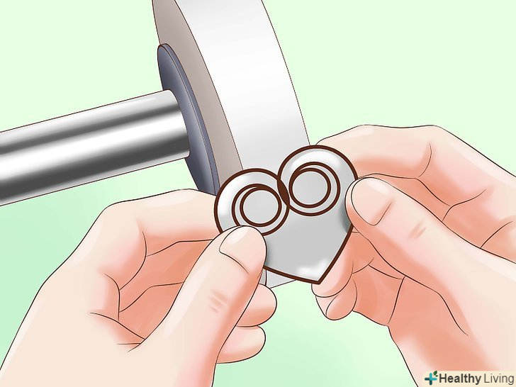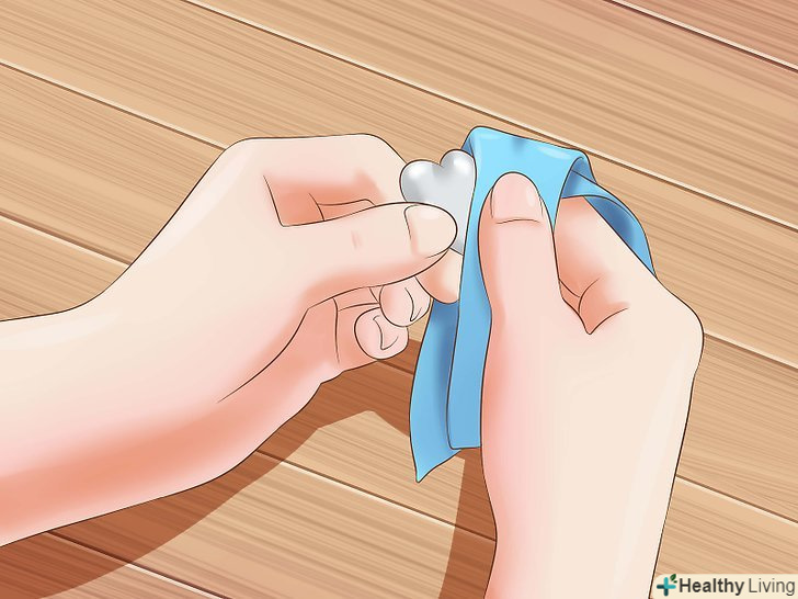 Поліруйте прикрасу на полірувальній машині. дотримуйтесь інструкцій у посібнику користувача. Як правило, ювелір включає машину і наносить на метал полірувальний порошок в невеликих кількостях. Злегка доторкніться прикрасою до обертової пластини, щоб згладити гострі краї і відполірувати поверхню. [15]