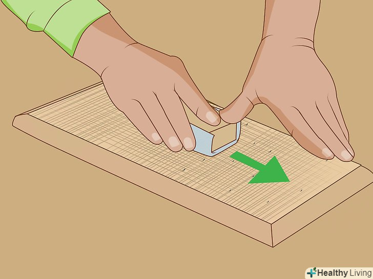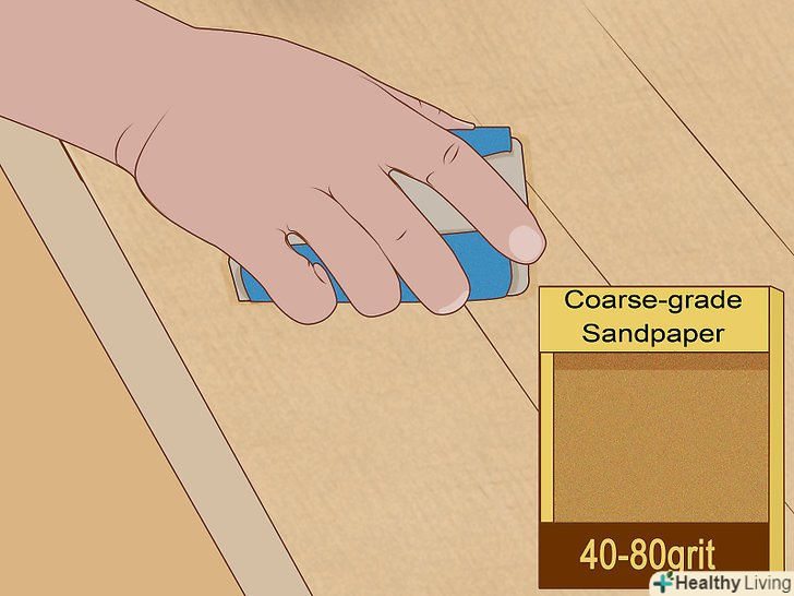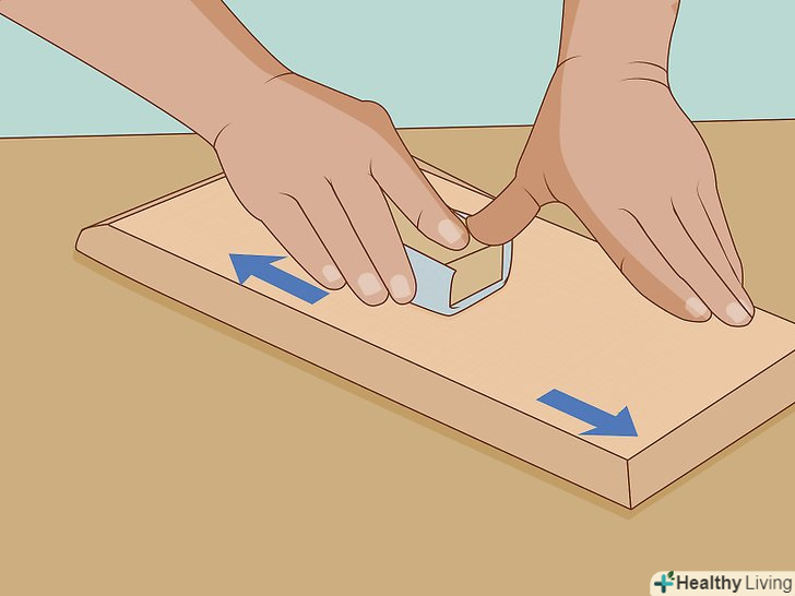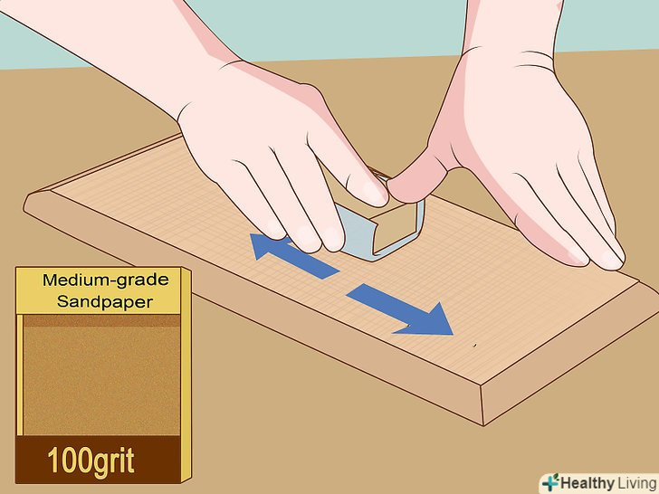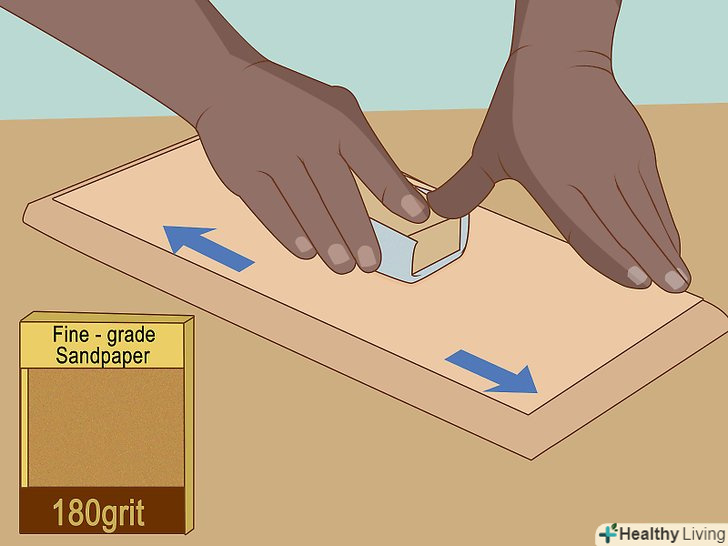 Проведіть наждачним папером по поверхні. при обробці деревини переконайтеся в тому, що ви рухаєтеся у напрямку, а не поперек деревних волокон. Напрямок волокон деревини можна визначити по лініях і візерунках на її поверхні. [15]- Наприклад, якщо ви обробляєте поверхню дерев'яної стільниці, лінії візерунків на якій йдуть від переднього до заднього краю, то вам необхідно працювати наждачним папером у напрямку від переднього краю стільниці до заднього і назад.