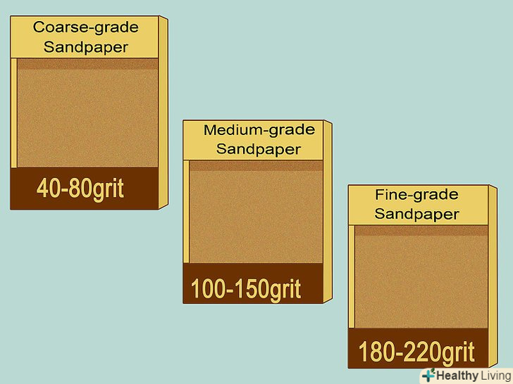 Купіть необхідну Вам наждачний папір в трьох розмірах зерна. наждачний папір умовно можна розділити на три групи: грубозерниста, із середнім розміром зерна і дрібнозерниста. У Росії прийнята маркування наждачного паперу по ISO-6344, відповідно до якої зернистість позначається буквою Р і цифрою. Чим вище цифра, тим менше розмір зерна (саме число позначає кількість дротів сита на дюйм) і тим більш гладкою стане поверхня після шліфування таким папером. Перевірте інформацію на упаковці наждачного паперу, щоб знайти там інформацію про її зернистості. Купіть для свого проекту наждачний папір з різним розміром зерна (великим, середнім і дрібним). [7]- Грубозернистий наждачний папір для грубої обробки маркується числом від 40 до 80. При цьому дрібнозернистого паперу P80 повинно бути цілком достатньо, якщо тільки на оброблюваної поверхні немає істотних дефектів, які потрібно сточити. [8]